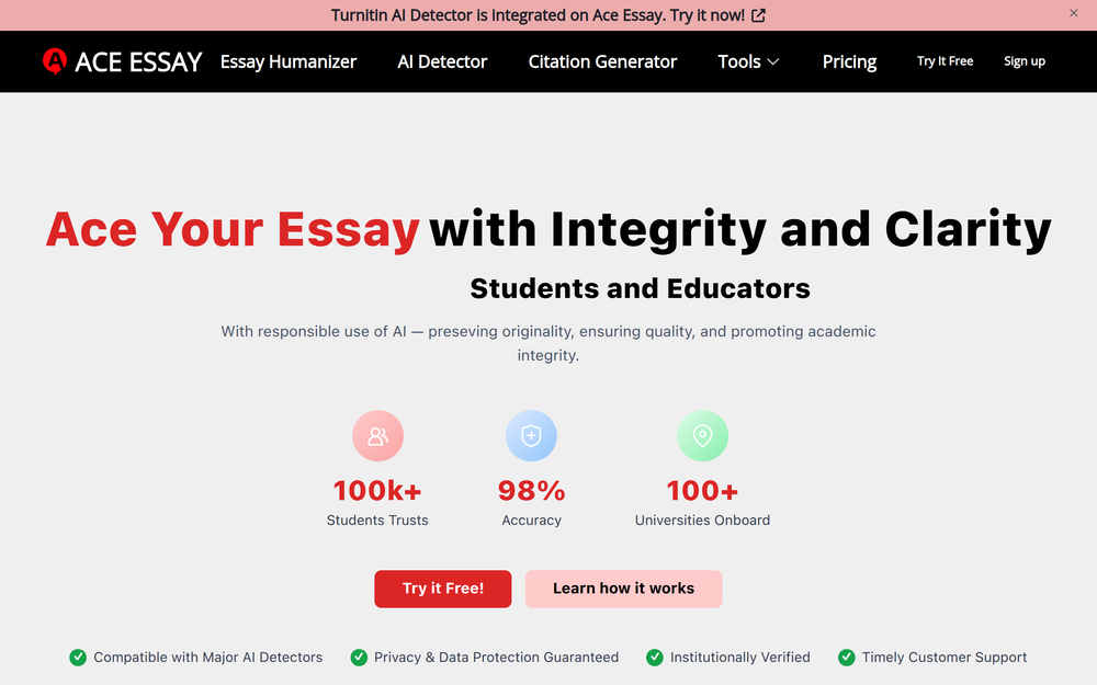 Ace Essay: AI writing assistant for humanizing text, detecting AI content, and ensuring essay originality.