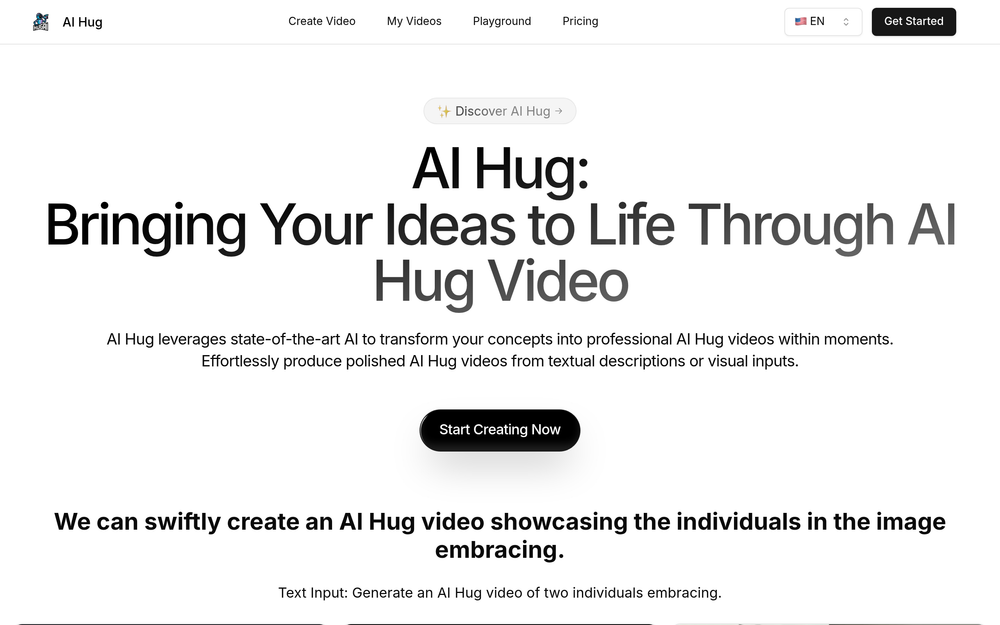 AI Hug is a revolutionary AI-powered video generation tool that transforms your ideas into engaging videos with remarkable ease and speed. Leveraging state-of-the-art artificial intelligence, AI Hug allows you to create professional-quality videos from simple text descriptions or even visual inputs, bringing your concepts to life in moments. Whether you aim to produce content for advertising, educational purposes, or personal creative projects, AI Hug offers an intuitive and efficient solution. The platform is designed to democratize video creation, removing the need for extensive technical expertise or expensive equipment.