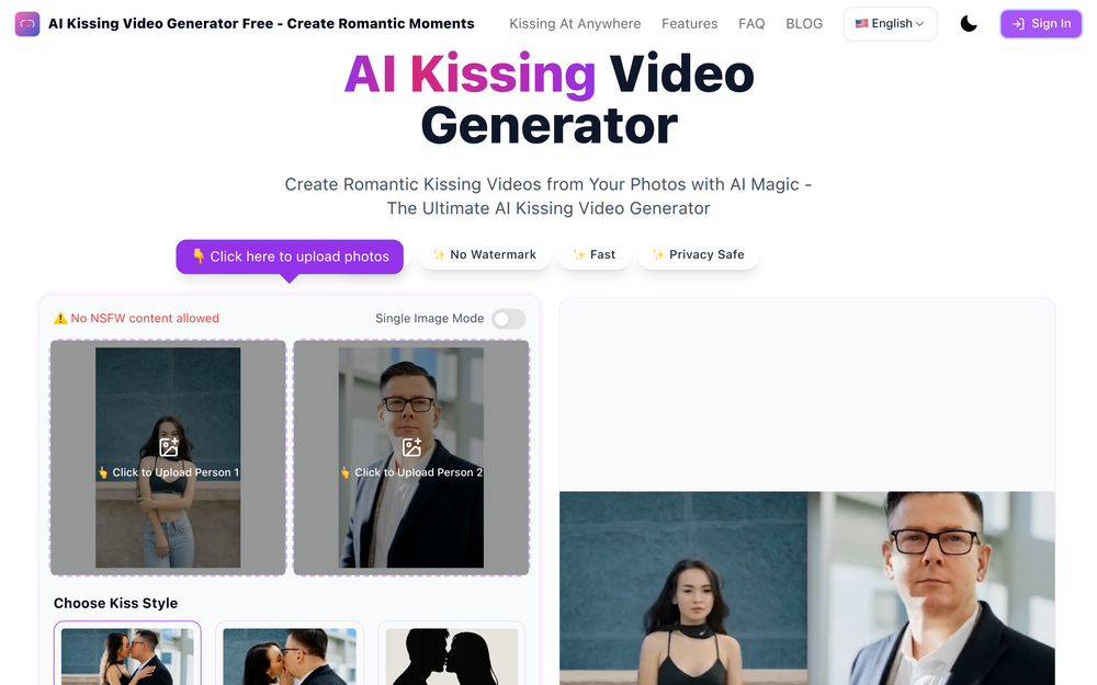 Create romantic AI kissing videos from photos. Free, fast, and private. Generate unique love moments.