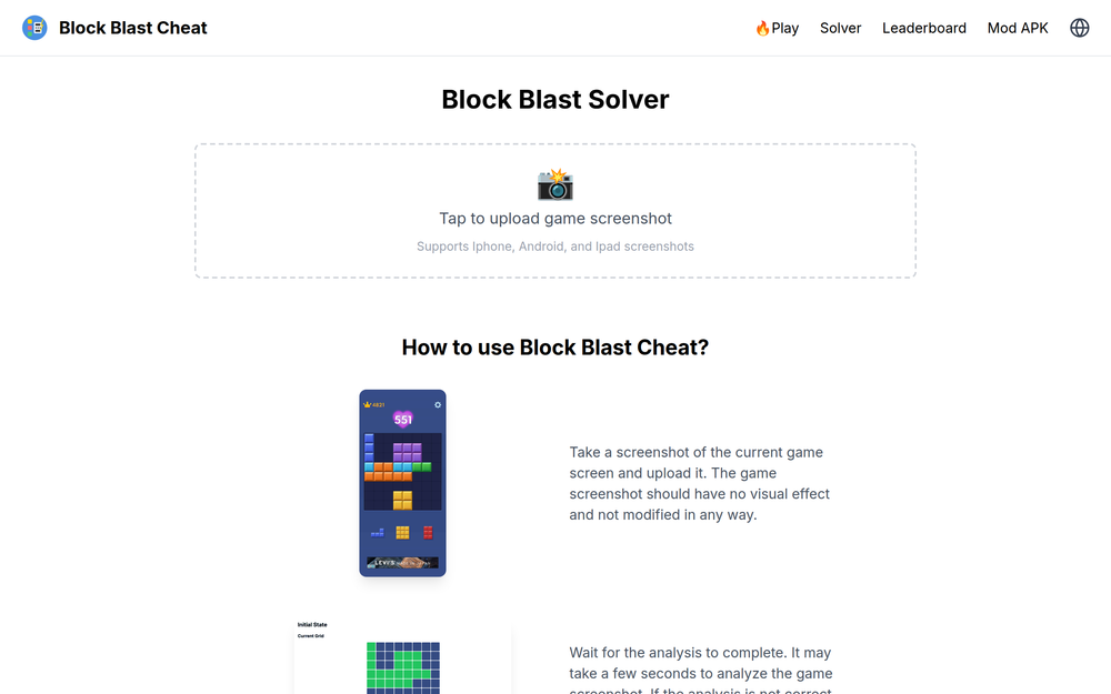 Block Blast Cheat is a free online AI-powered solver designed to help players achieve the highest scores in the popular Block Blast game. By simply uploading a screenshot of your current game, the tool analyzes the puzzle and provides the optimal moves to maximize your score. This innovative solution eliminates the need for manual calculation or guesswork, making it easier for players of all skill levels to excel. The platform is accessible directly through your web browser, requiring no downloads or installations, ensuring a seamless user experience.