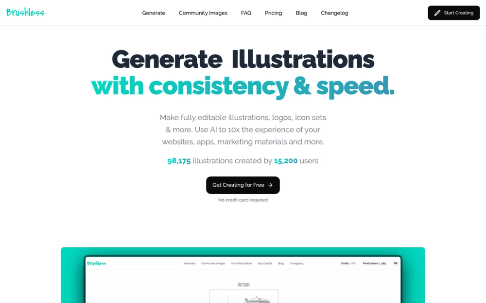 Brushless AI is a powerful artificial intelligence tool designed to revolutionize the way individuals and businesses create visual content. It specializes in generating consistent, editable vector illustrations, logos, and icon sets at an unprecedented speed. By leveraging advanced AI models, Brushless AI empowers users to 10x their design output, making it easier than ever to enhance websites, applications, marketing materials, and more with unique, brand-aligned visuals. The platform aims to solve the common challenge of finding high-quality, cohesive graphics that perfectly match a brand's identity, eliminating the need for generic stock images or time-consuming manual design processes.
