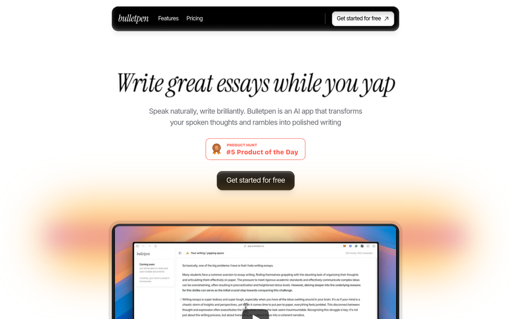 Bulletpen: Transform spoken thoughts into polished essays with AI. Speak naturally, write brilliantly. Free plan available.