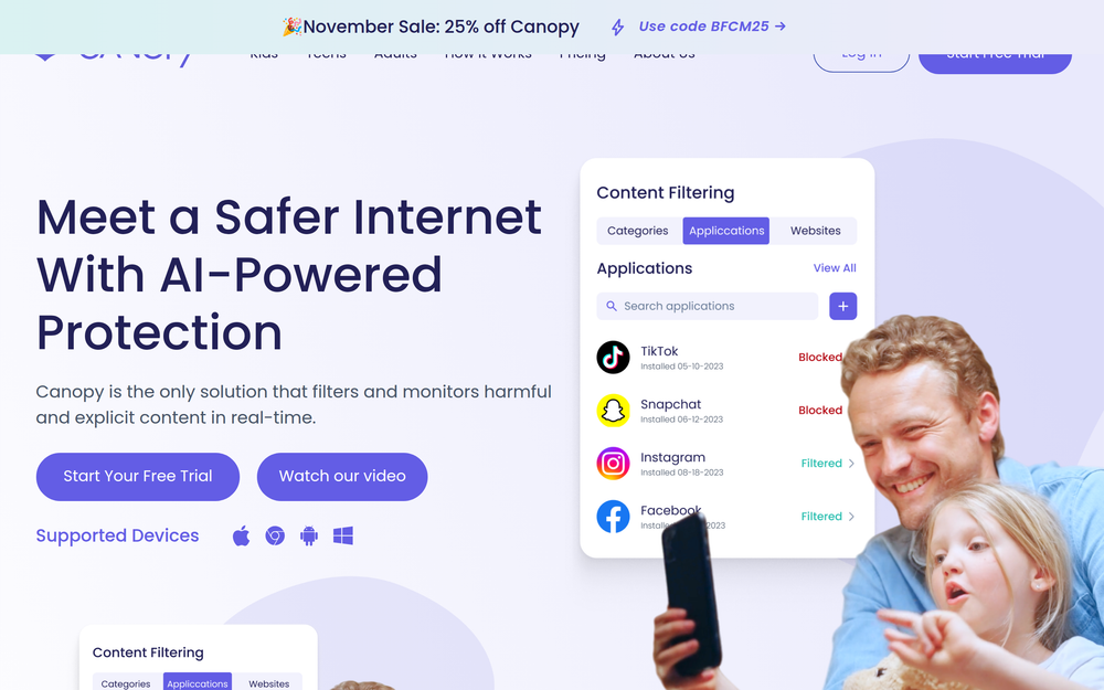 Canopy is a comprehensive AI-powered digital safety solution designed to protect children and families from the risks of the internet. In an era where children are increasingly exposed to explicit content, cyberbullying, and the mental health challenges associated with excessive screen time, Canopy offers a robust, real-time filtering and monitoring system. It goes beyond traditional content blockers by utilizing advanced AI to detect and filter harmful content across various platforms, including social media, ensuring a safer online environment for young users.
