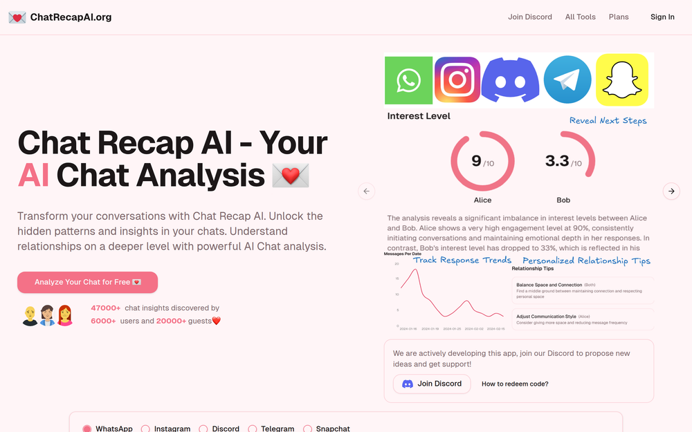 Transform your conversations with Chat Recap AI, an intelligent platform designed to unlock hidden patterns and insights within your digital interactions. This powerful AI chat analysis tool helps you understand relationship dynamics on a deeper level by examining message patterns, response times, and emotional content. Whether you're looking to improve romantic relationships, understand friend group dynamics, or enhance your personal communication style, Chat Recap AI provides data-driven insights to foster better connections.