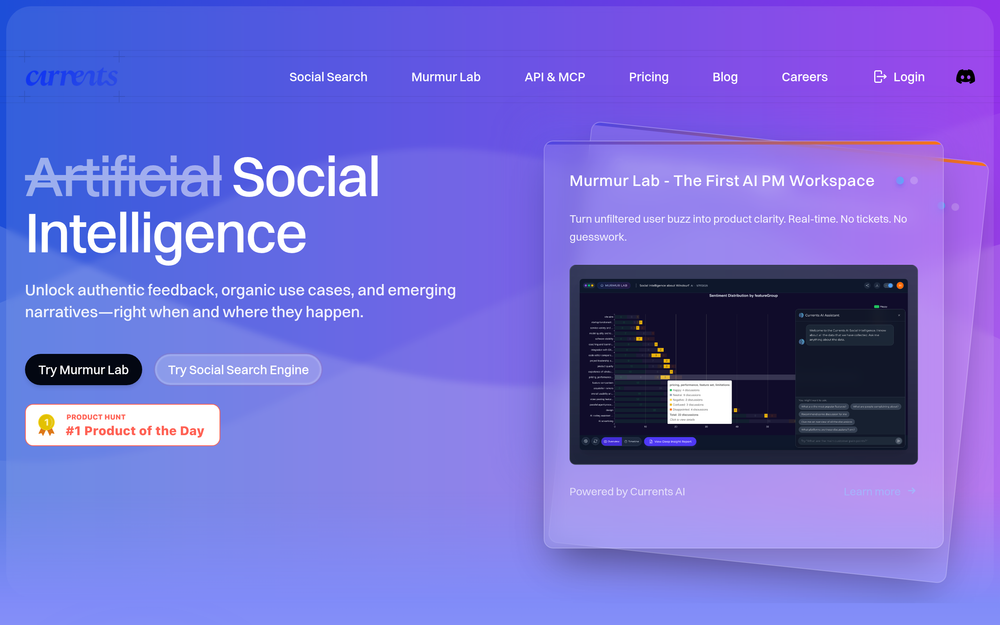 The platform offers two powerful tools: Murmur Lab, the first AI Product Management Workspace, and the Currents Search Engine, a real-time social search engine. These tools empower teams to move beyond guesswork and traditional, often slow, market research methods. By tapping into the "murmur" of everyday conversations, businesses can gain a competitive edge, identify niche opportunities, and foster genuine connections with their audience. Currents AI is built for those who understand that listening is not just a feature, but the foundation of successful product development and business strategy.