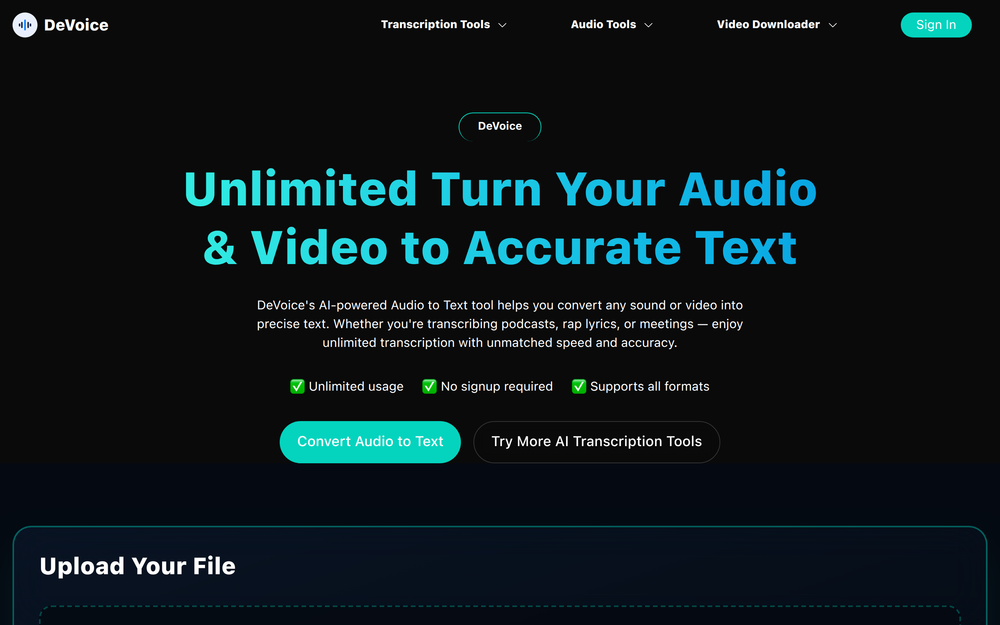 AI-powered audio & video transcription with unlimited usage, no signup required, and support for all formats.