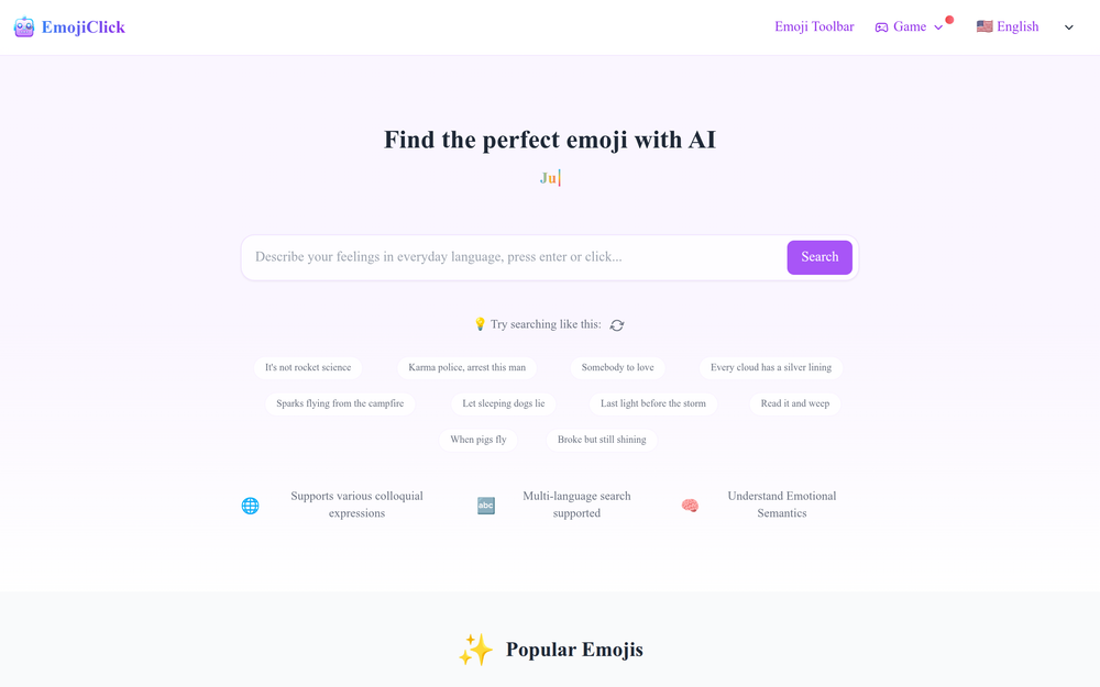 In the fast-paced world of digital communication, conveying the right emotion and tone is crucial. EmojiClick is an innovative AI tool designed to bridge the gap between your thoughts and the perfect emoji. Whether you're trying to express a complex feeling, a nuanced emotion, or just a simple sentiment, EmojiClick helps you find the ideal emoji in seconds.