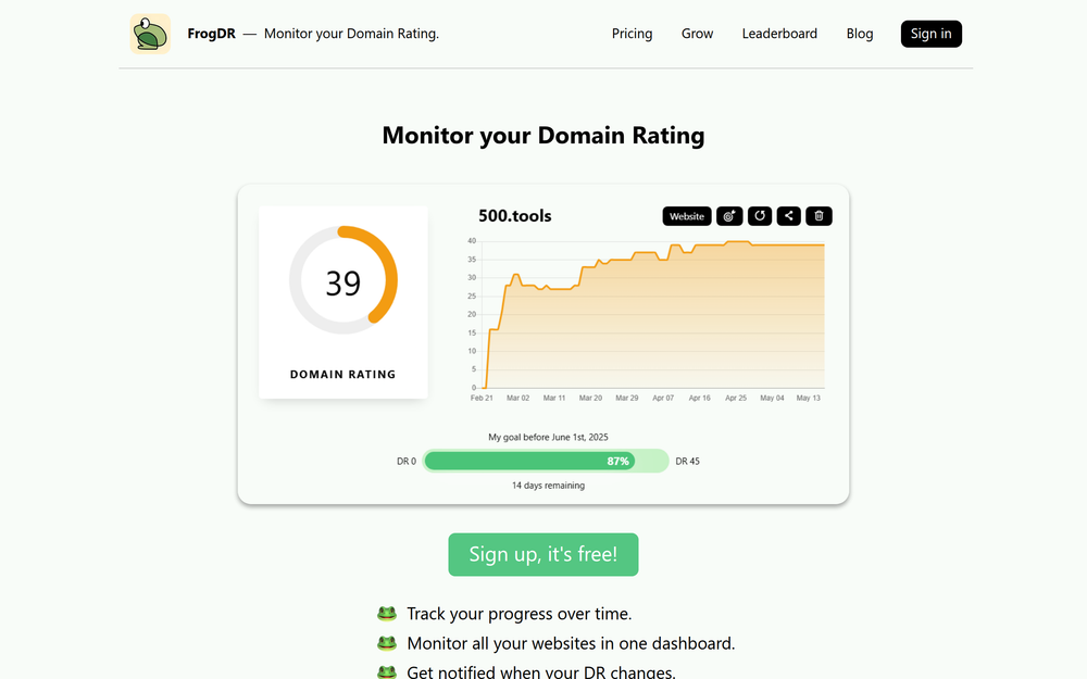 FrogDR: Monitor your Domain Rating (DR) and track website progress over time. Free sign-up available.