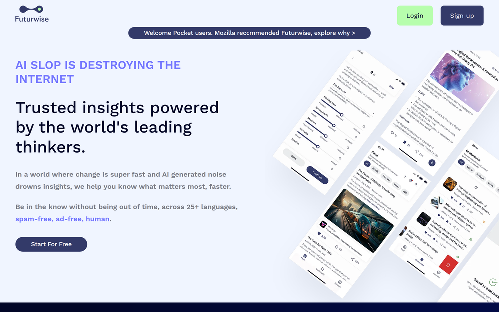 In today's rapidly evolving digital landscape, AI-generated content often creates noise that drowns out valuable insights. Futurwise emerges as a solution, offering a platform that prioritizes trusted, human-curated information and delivers it through concise, personalized summaries. It aims to help users stay informed without feeling overwhelmed, saving them time and enhancing their decision-making capabilities.