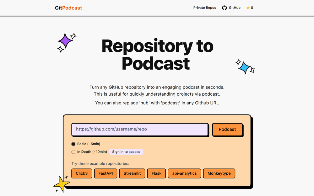 Turn GitHub repositories into engaging podcasts for quick project understanding.