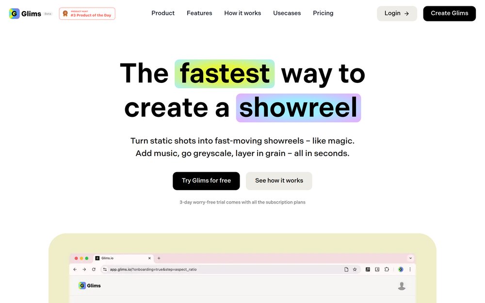 Glims: Effortlessly create stunning video showreels and GIFs from static shots in seconds. Add music, effects, and more.