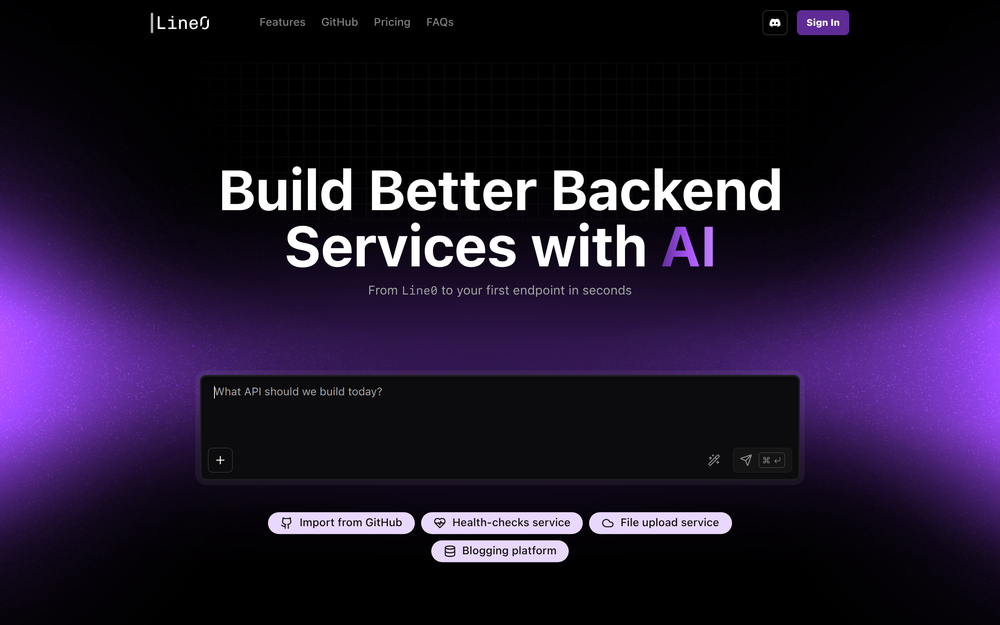 Line0: AI pair programmer for building backend services in minutes. Import from GitHub, edit code, and test APIs instantly.