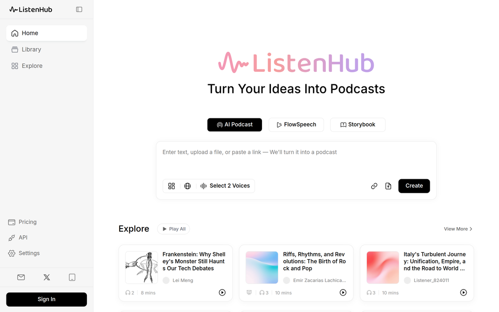 ListenHub: AI-powered podcast generator. Turn text, PDFs, and more into realistic AI-narrated podcasts.