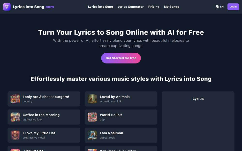 Lyrics into Song is a cutting-edge AI-powered platform designed to effortlessly transform your written lyrics into complete, melodious songs. Whether you're a songwriter looking to quickly demo ideas, a poet wanting to hear your words sung, or a musician seeking inspiration, this tool bridges the gap between text and music. It analyzes the sentiment and structure of your lyrics to generate fitting melodies, harmonies, and even vocal performances, offering a seamless way to bring your lyrical creations to life.