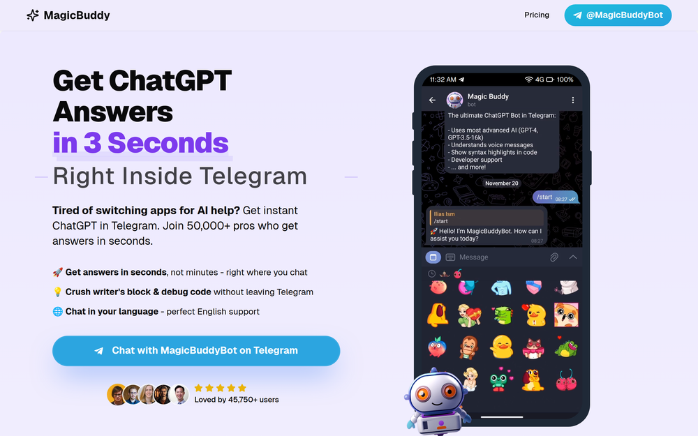 Get instant ChatGPT answers in Telegram with MagicBuddy, your AI assistant for quick responses and content creation.