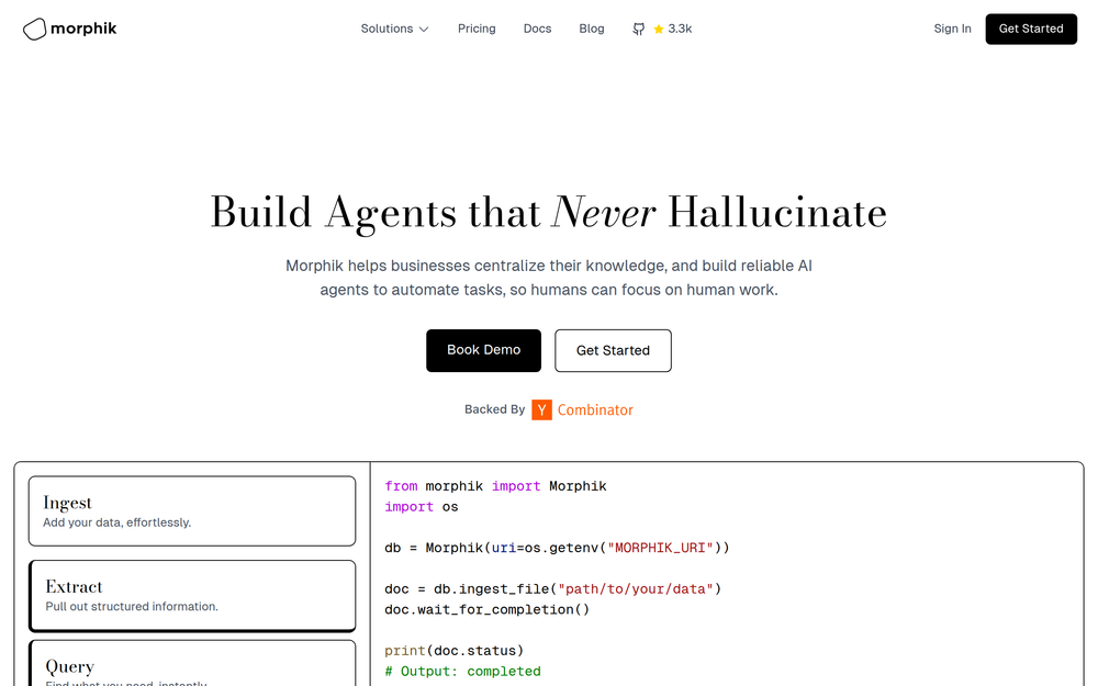 Morphik is a powerful AI platform designed to help businesses build reliable AI agents that centralize knowledge and automate tasks, freeing up human resources for more complex work. By addressing the common issue of AI hallucination, Morphik ensures that the AI agents it helps create are trustworthy and accurate.