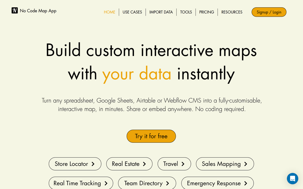 Build custom interactive maps with AI. No code needed. Import data from spreadsheets, Airtable, Google Sheets & Webflow.