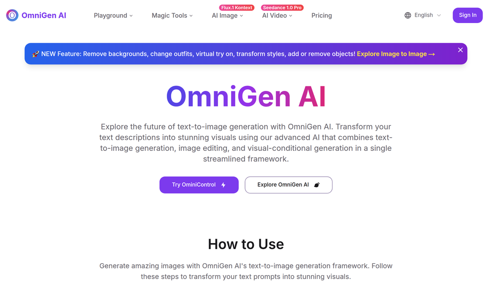 The platform streamlines the creative process by consolidating multiple AI generation tasks into a single, intuitive interface. Whether you're looking to generate unique artwork from a simple text description, refine existing images with powerful editing tools, or guide the generation process with visual references, OmniGen AI provides a versatile and efficient solution.