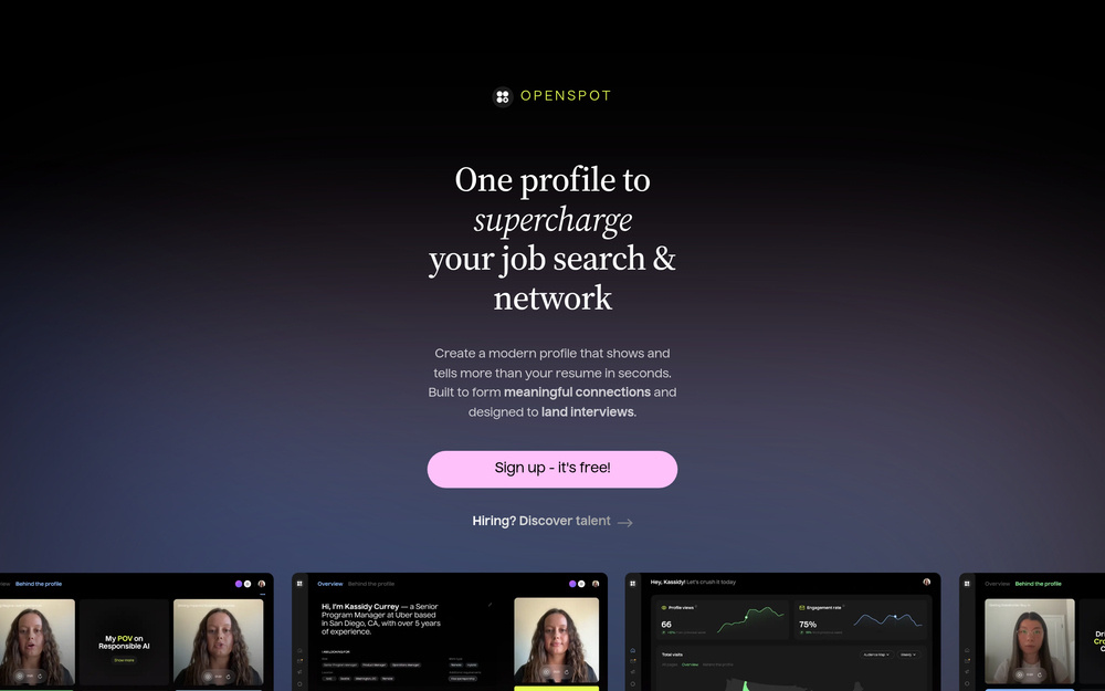 Openspot is a revolutionary AI-powered platform designed to transform your job search and professional networking experience. It empowers you to create a dynamic, modern profile that goes beyond the limitations of a traditional resume, showcasing your skills, personality, and unique value proposition in engaging video, audio, or written formats. By facilitating meaningful connections and providing intelligent tools, Openspot aims to help you land more interviews and accelerate your career growth. The platform is built for individuals seeking to stand out in a competitive job market and for hiring managers looking to discover top talent efficiently.