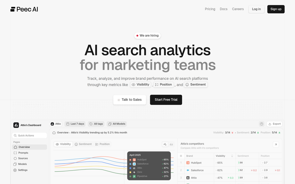 Peec AI: Track and enhance brand visibility on AI search platforms. Gain insights into metrics like Visibility, Position, and Sentiment.