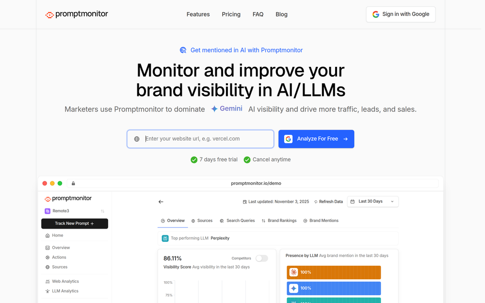 Promptmonitor: Optimize AI visibility, track brand mentions, and dominate AI search results. Boost traffic & leads.