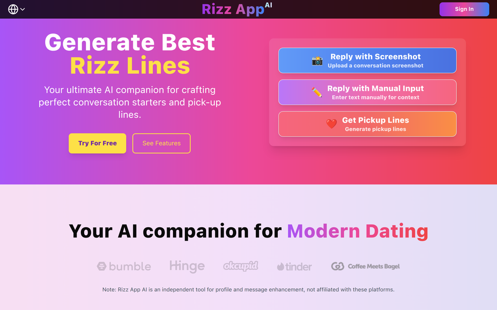 Rizz App AI is your ultimate AI companion for navigating the complexities of modern dating. This innovative tool is designed to help you craft compelling conversation starters, witty pick-up lines, and engaging replies that significantly boost your response rates and help you forge genuine connections. By leveraging advanced AI, Rizz App AI analyzes context and user input to generate personalized messages that reflect your unique style and personality, ensuring your interactions feel authentic and effective.