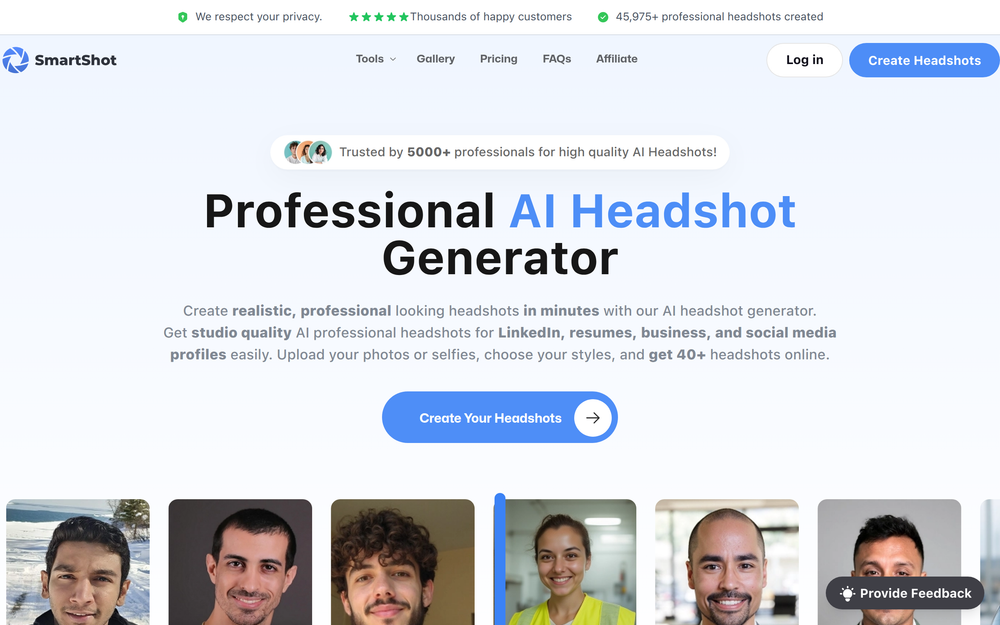 Generate professional AI headshots in minutes. Upload photos, choose styles, and get 40+ studio-quality headshots.