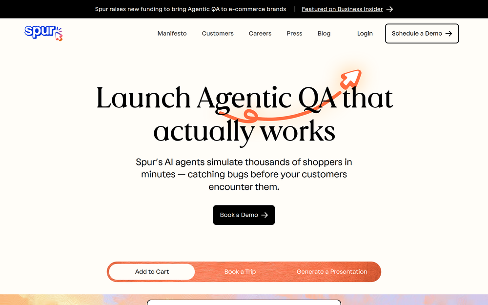 Spur is a revolutionary AI-powered Quality Assurance (QA) platform designed to bring "Agentic QA" to e-commerce brands. It leverages advanced AI agents that simulate thousands of shopper behaviors in minutes, proactively identifying and rectifying bugs before they impact real customers. This innovative approach ensures a seamless user experience and boosts confidence in product releases.