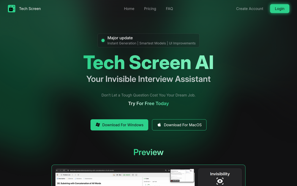 The platform is built with invisibility as a core feature, ensuring it remains undetected by screen-sharing software and recording tools on popular platforms like Zoom, Google Meet, and CoderPad. This allows you to leverage AI assistance with confidence, knowing your privacy and the integrity of the interview process are maintained. With useful shortcuts and an always-on active tab feature, Tech Screen integrates smoothly into your workflow, minimizing disruptions and keeping you focused.
