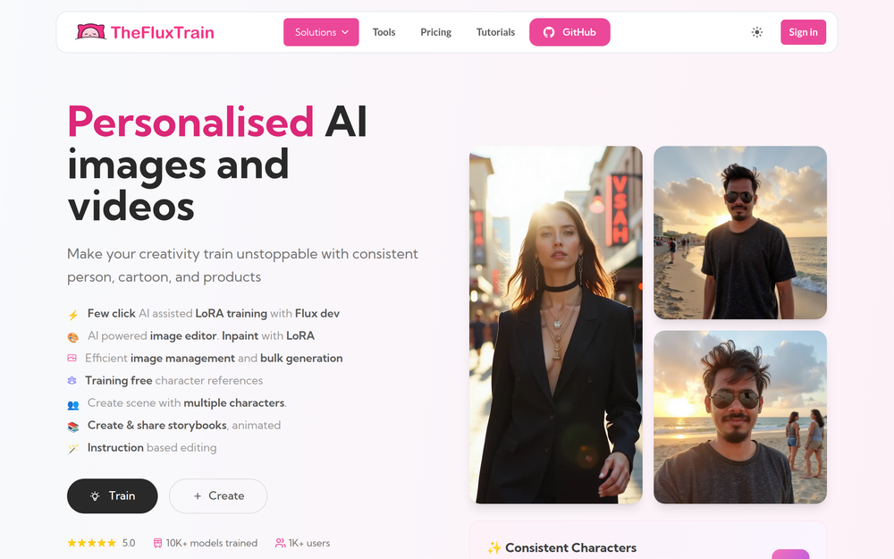 TheFluxTrain is a powerful AI platform designed to revolutionize content creation by enabling users to generate consistent visual assets, including images and videos, with remarkable ease. It empowers individuals and businesses to bring their creative visions to life, whether it's crafting unique characters, developing engaging storybooks, or producing professional marketing materials. The platform focuses on user-friendliness, allowing for AI-assisted LoRA training with as few as 3-9 images, making custom model creation accessible to a wider audience.