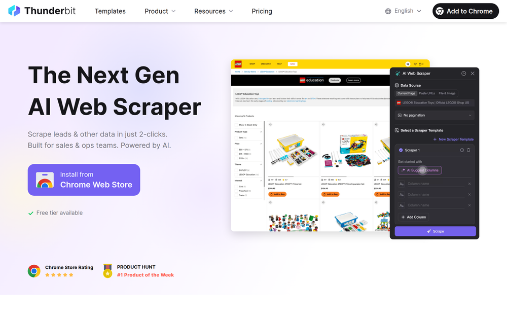 Thunderbit is a powerful AI-driven Chrome extension designed to revolutionize the way you collect data from the web. In just two clicks, you can scrape virtually any website and have the information automatically organized into a structured table. Whether you're in sales, operations, marketing, or research, Thunderbit empowers you to gather valuable data efficiently, saving you significant time and effort.