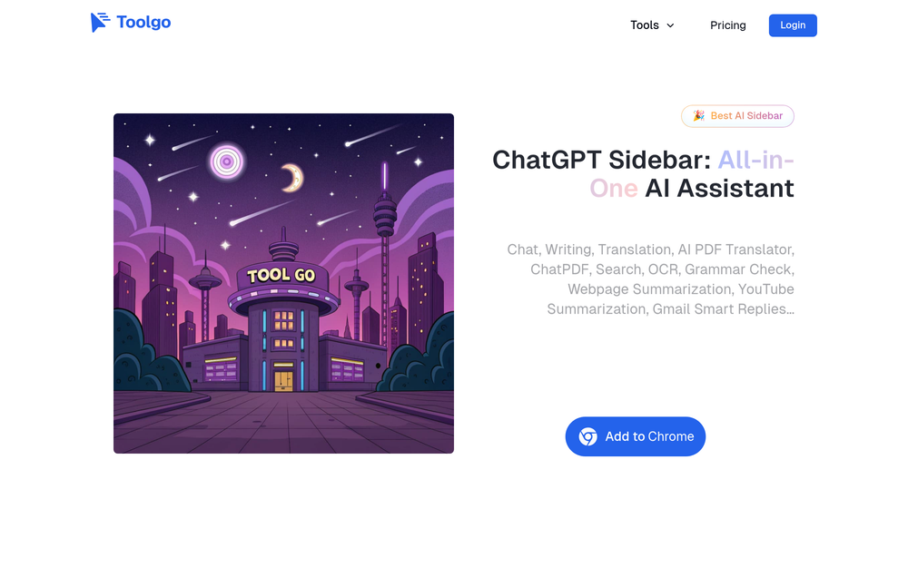 Toolgo: Free all-in-one AI sidebar for ChatGPT, PDF translation, ChatPDF, writing, and more. Boost productivity.