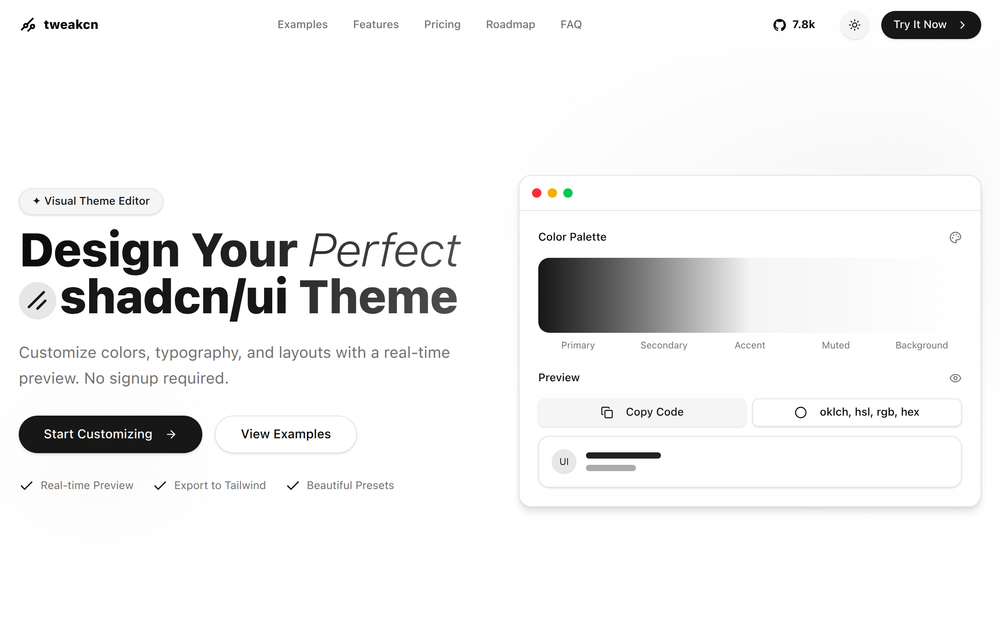 Visually customize colors, typography, and layouts with a real-time preview. Supports OKLCH, HSL, RGB, and HEX color formats.