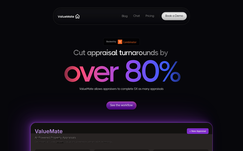 ValueMate is a cutting-edge AI-powered appraisal tool engineered to revolutionize the way residential property appraisals are conducted. By leveraging advanced AI, ValueMate significantly enhances efficiency, allowing appraisers to complete their reports up to 5X faster and cut down appraisal turnarounds by over 80%.