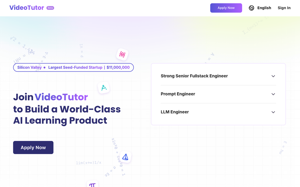 VideoTutor is a cutting-edge AI learning product focused on revolutionizing math education. This generative video explainer platform leverages artificial intelligence to create personalized and easy-to-understand video tutorials for a wide spectrum of mathematical subjects. From foundational elementary concepts to advanced college-level topics, VideoTutor aims to make learning accessible and engaging for students at every stage of their academic journey.