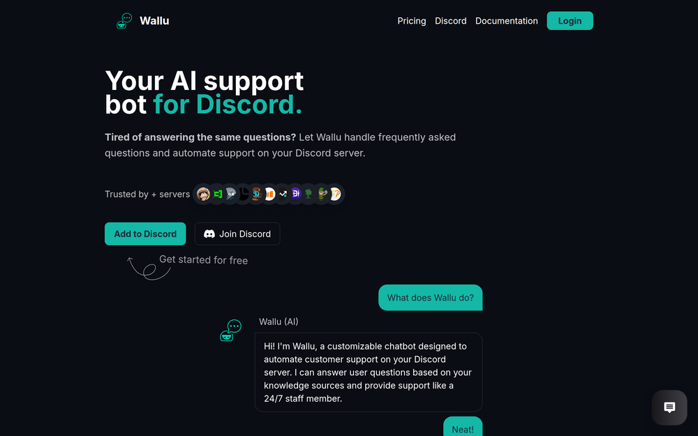 Automate Discord support with Wallu, an AI chatbot that answers FAQs, manages tickets, and learns from your data.