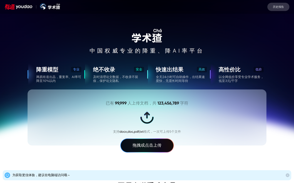 学术猹 (Xue Shu Cha) is a professional platform developed by NetEase Youdao, dedicated to helping students and researchers improve the quality of their academic papers. It specializes in reducing both text repetition and AI-generated content detection rates, ensuring that papers meet the stringent requirements of academic institutions. With a strong backing from NetEase Youdao, a leader in intelligent education technology, Xue Shu Cha leverages advanced AI models and extensive academic resources to provide reliable and efficient solutions.