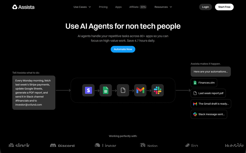 Assista AI Agents 是专业人士、企业家、销售团队、项目经理、营销人员以及任何希望通过自动化重复性数字任务来简化工作流程并提高生产力的人的理想选择。