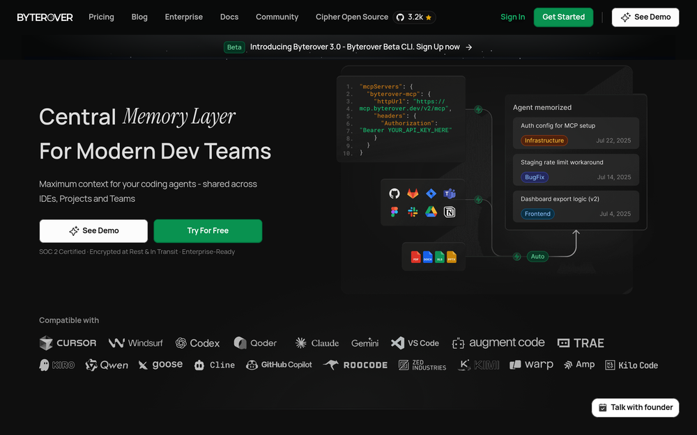 Byterover 是一款革命性的 中央记忆层 (Central Memory Layer),旨在通过为编程智能体提供 极致的上下文 (maximum context),赋能现代开发团队。在 AI 辅助开发快速演进的格局中,保持一致且相关的上下文至关重要。Byterover 通过创建一个共享的、持久的记忆层来解决这一问题,智能体可以跨不同的集成开发环境 (IDE)、项目和团队成员访问该记忆层。这确保了 AI 智能体能够基于积累的经验进行构建,而不是遗忘过去的交互和学到的信息,从而实现更高效、更准确的代码生成和问题解决。