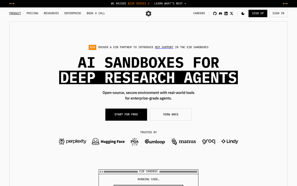 E2B 代表“企业级 AI 智能体云(Enterprise AI Agent Cloud)”。它是一个为 AI 智能体提供安全、隔离环境(沙箱)的平台,智能体可以在其中执行代码、与工具交互并执行广泛的任务。这些沙箱由 Firecracker 微型虚拟机(microVMs)驱动,提供极高水平的安全性和隔离性。E2B 旨在弥合 AI 模型与现实应用之间的鸿沟,使智能体能够超越简单的文本生成,参与到复杂的决策和问题解决中。