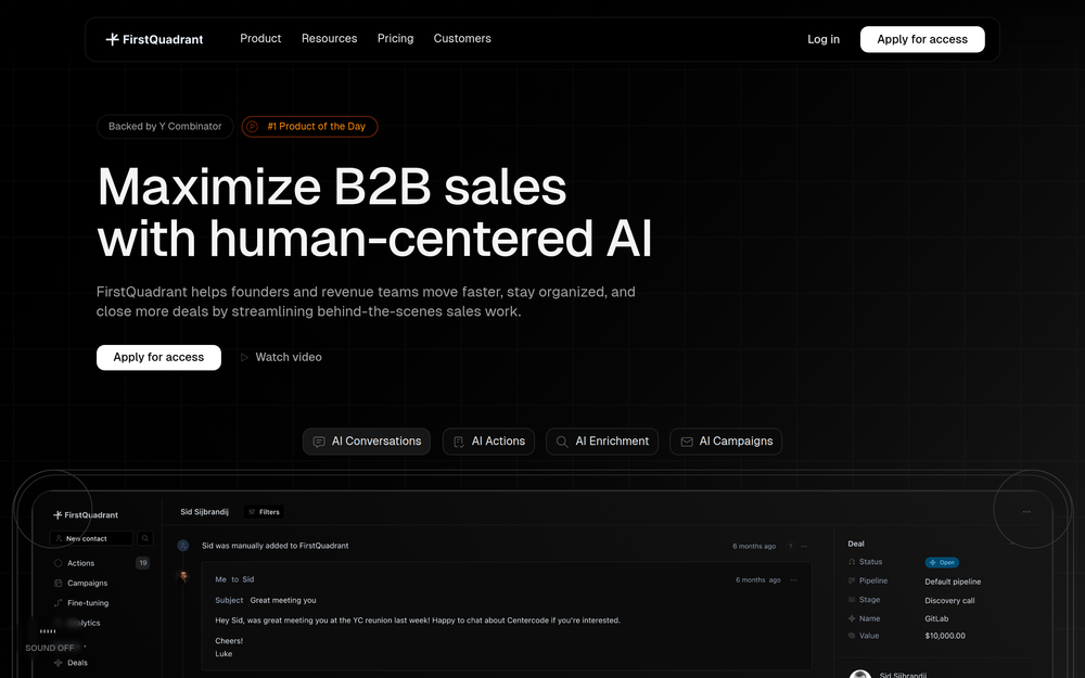 FirstQuadrant 是一款 AI 驱动的解决方案,作为一套涵盖漏斗管理、关系管理和漏斗顶端增长的综合套件。它利用先进的 AI 推理来理解销售对话,识别最佳的后续行动,并自动化关键的销售工作流,确保不漏掉任何机会。