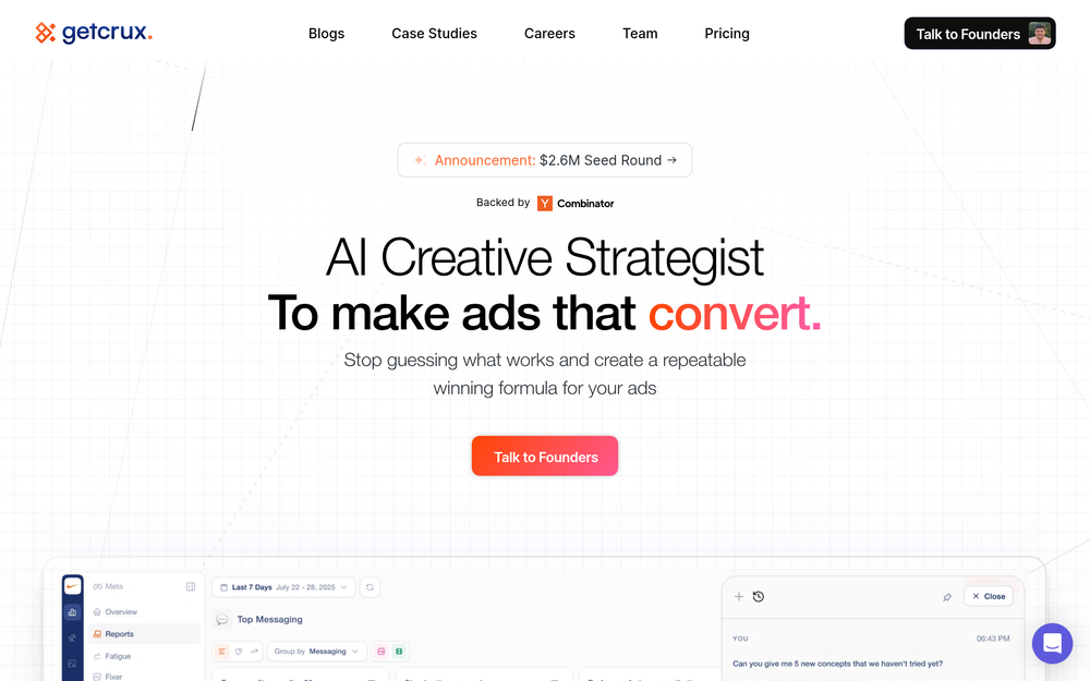 GetCrux 充当绩效营销的 AI 副驾驶(Copilot)。它利用先进的 AI 技术分析广告创意中的每一个元素,识别成功案例中的模式,并提供可落地的洞察。它还会扫描来自评论、反馈和竞品广告中的受众情绪,以挖掘新的切入点和概念。最终,GetCrux 旨在帮助企业停止盲目尝试,建立一套可靠的高转化广告创作流程。