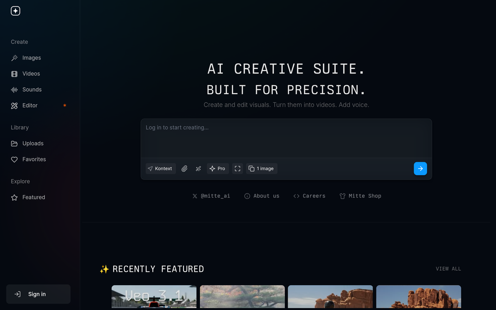 Mitte AI 是一个集成平台,结合了先进的人工智能能力,为创建和编辑图像、视频及声音提供无缝体验。它的目标是成为任何希望制作高质量数字内容的人的首选解决方案,且无需承担传统创意软件通常伴随的高学习成本。