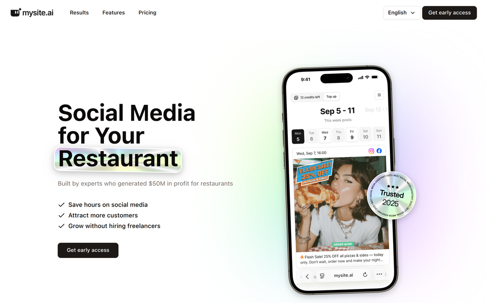 Mysite.ai 充当餐厅的社交媒体“自动驾驶仪”。它利用 AI 创建引人入胜的内容,设计吸睛的视觉效果,并在 Facebook 和 Instagram 等平台上选择最佳时间安排发布。该服务旨在将餐厅老板和员工从繁重的社交媒体管理中解放出来,让他们能够专注于核心业务——提供美食和卓越的客户体验。