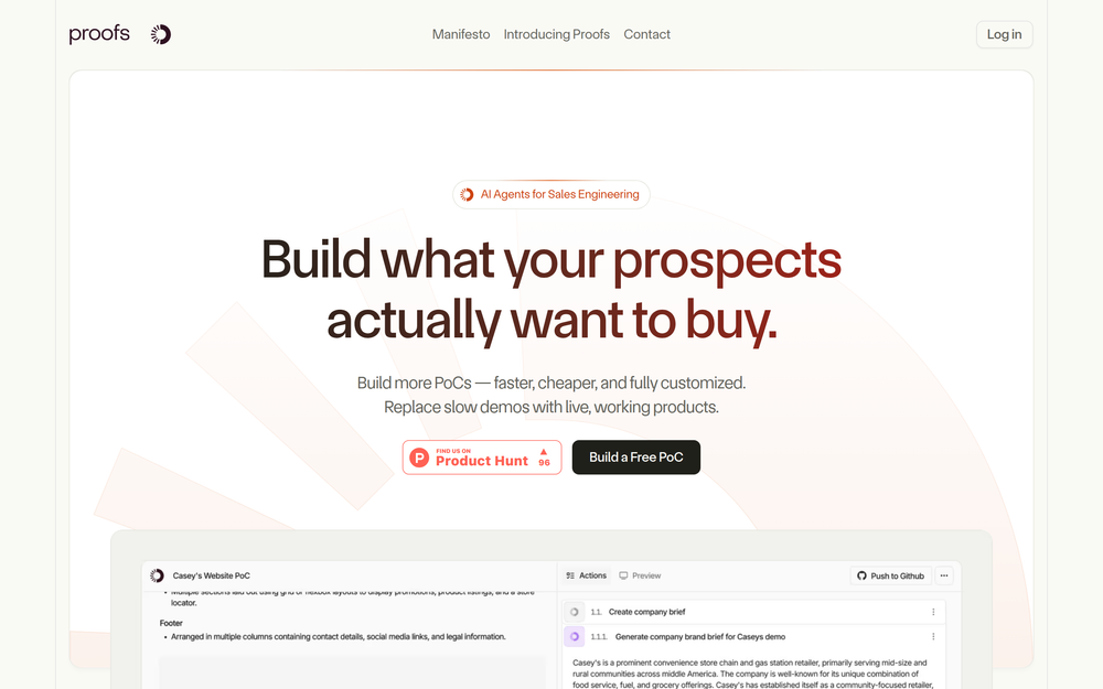 Proofs.io 通过利用 AI Agent 自动化创建概念验证(PoC),为销售工程提供了一种革命性的方法。该平台使企业能够为潜在客户构建定制的、实时运行的产品,其速度和成本效益显著优于传统方法。通过用自动化的、量身定制的解决方案取代缓慢的手动演示流程,Proofs.io 使销售团队能够扩大外展规模并达成更多交易。