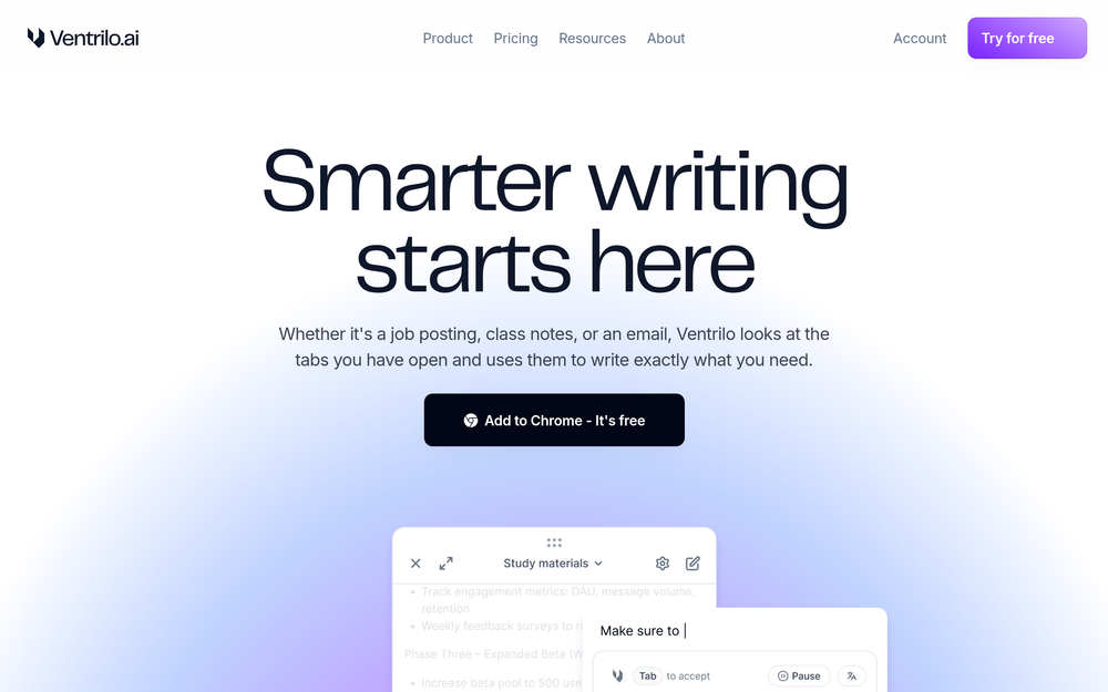 Ventrilo 是一款创新的 AI 驱动写作助手,旨在无缝集成到您的日常工作流中。通过分析您打开的浏览器标签页,Ventrilo 能够理解您的工作背景,并生成相关内容、提供智能文本建议以及实时翻译。它的目标是消除写作障碍,提高各种写作任务的效率。